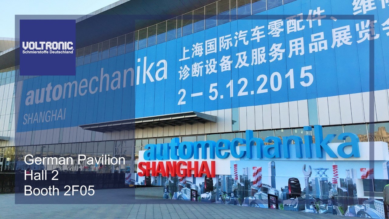 Greeting from VOLTRONIC Germany Team at Automechanika Shanghai 2015 German Pavilion Booth 2F05, the world’s largest automotive parts and accessories trade fair. Showcasing in this exhibition VOLTRONIC made in Germany premium products high performance lubricant (motor oil/engine oil), technical fluid (ATF, anti-freeze coolant, brake fluid, power steering and centralize hydraulic fluid), gear oil, additives, car care chemicals and industrial series lubricant and cleaner. Thank you for your patronized. 02-05 December 2015 National Exhibition and Convention Center (NECC), 333 Songze Ave., Shanghai, P.R. China.