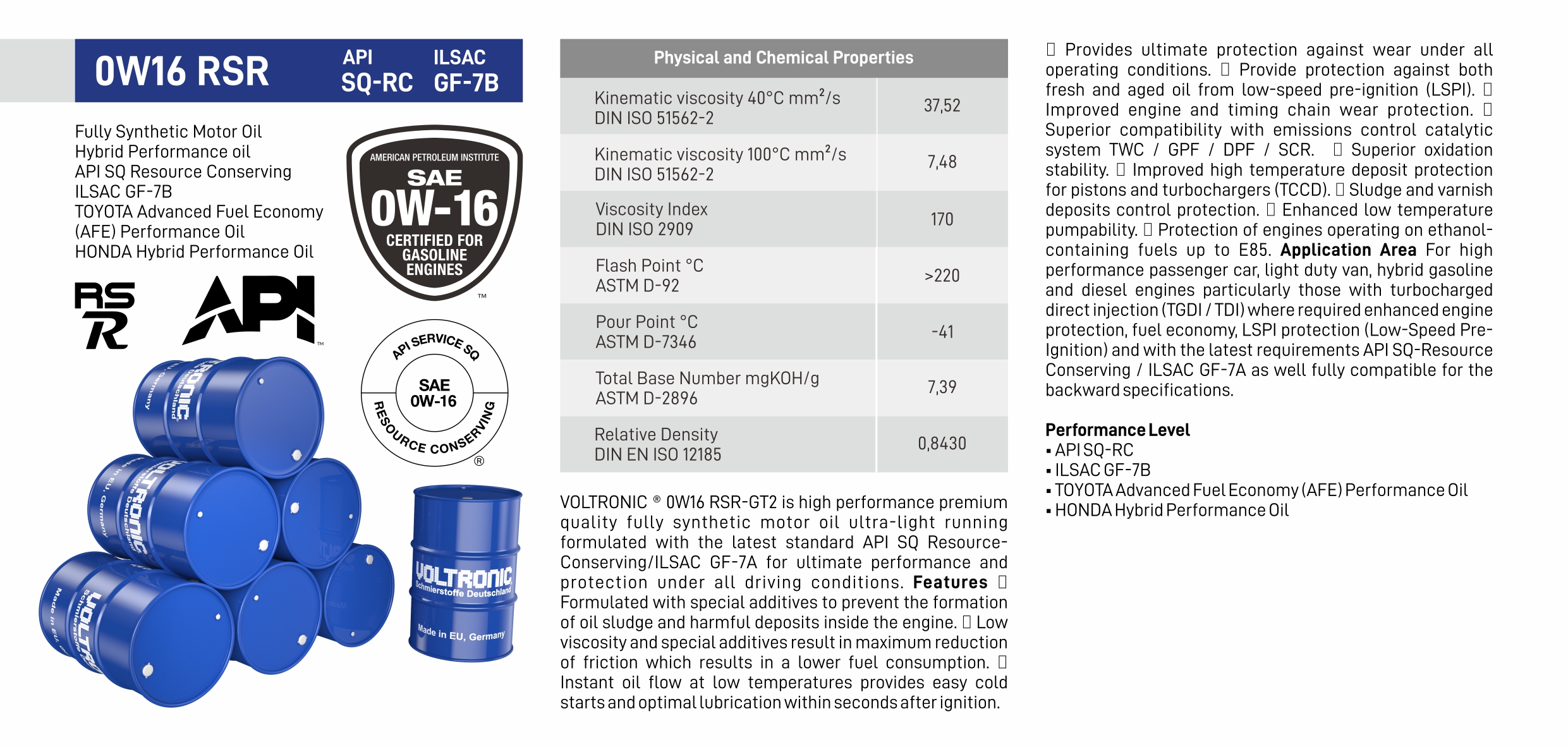 VOLTRONIC ® 0W16 RSR-GT2 is high performance premium quality fully synthetic motor oil ultra-light running formulated with the latest standard API SQ Resource-Conserving/ILSAC GF-7A for ultimate performance and protection under all driving conditions.