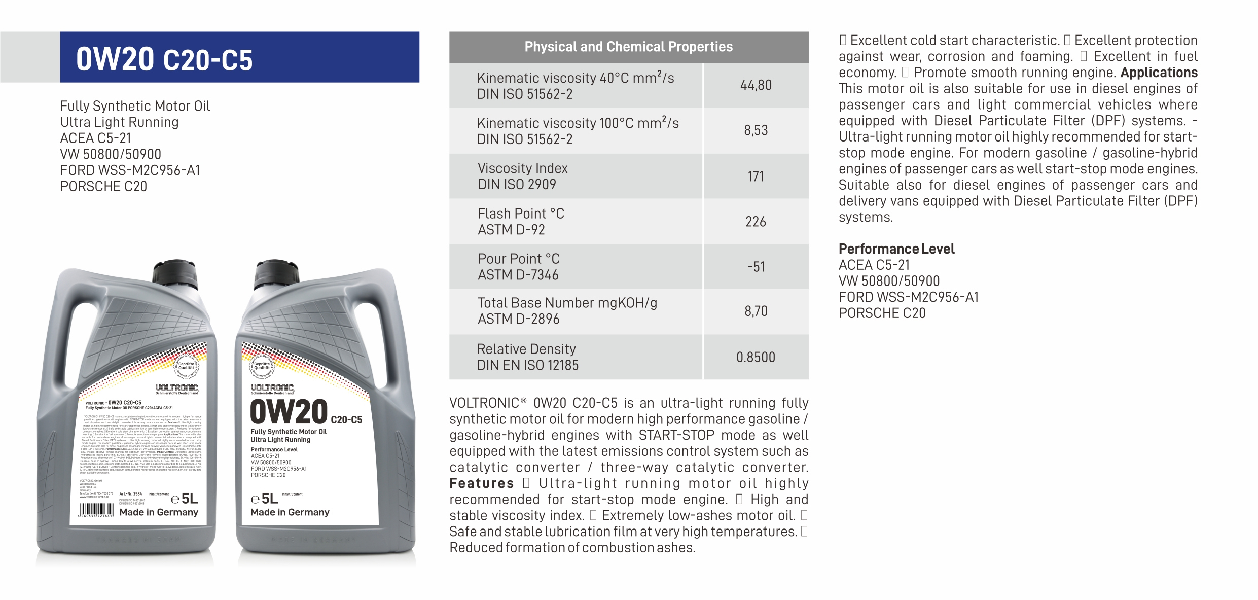 VOLTRONIC® 0W20 C20-C5 is an ultra-light running fully synthetic motor oil for modern high performance gasoline / gasoline-hybrid engines with START-STOP mode as well equipped with the latest emissions control system such as catalytic converter / three-way catalytic converter.