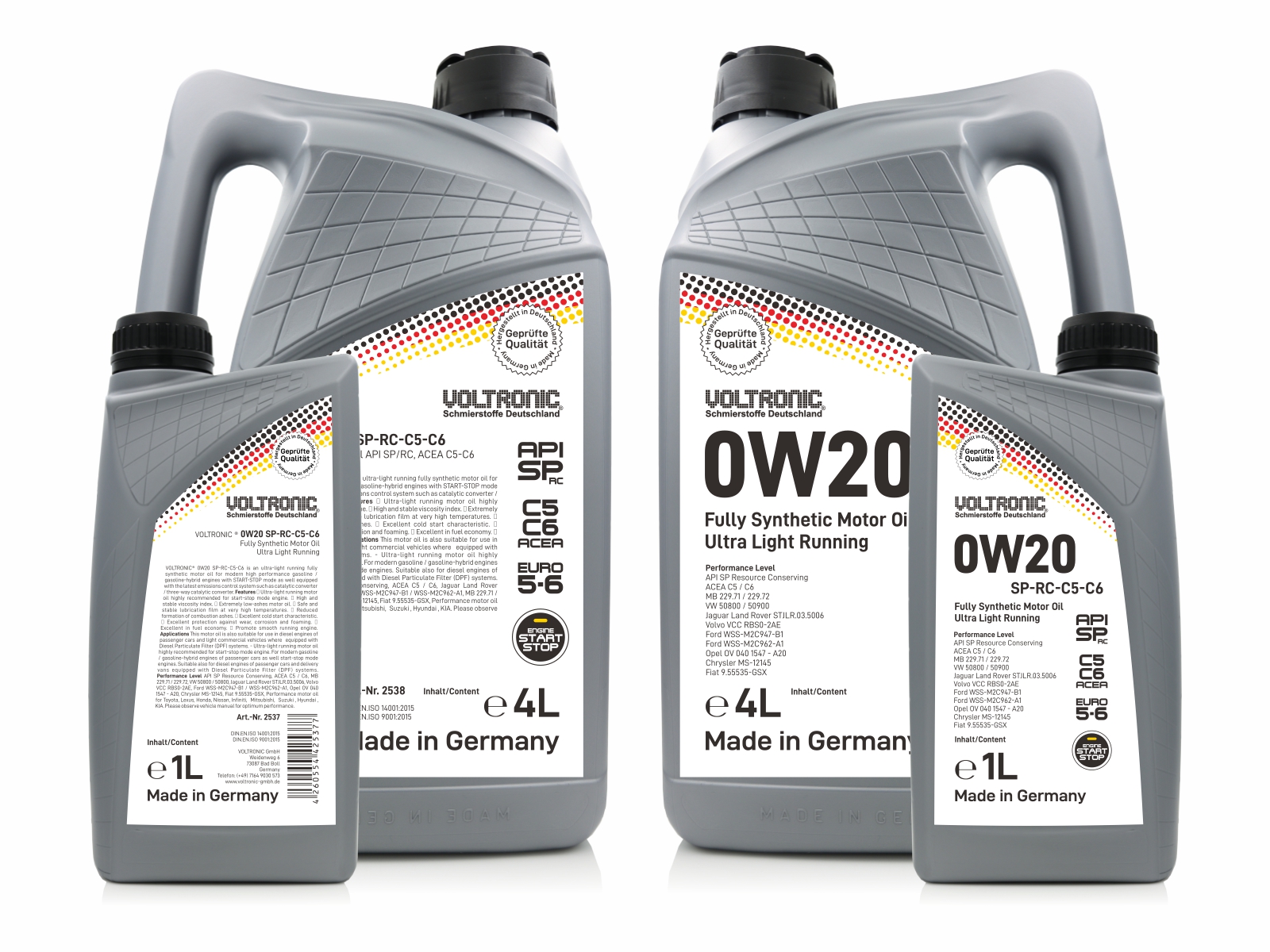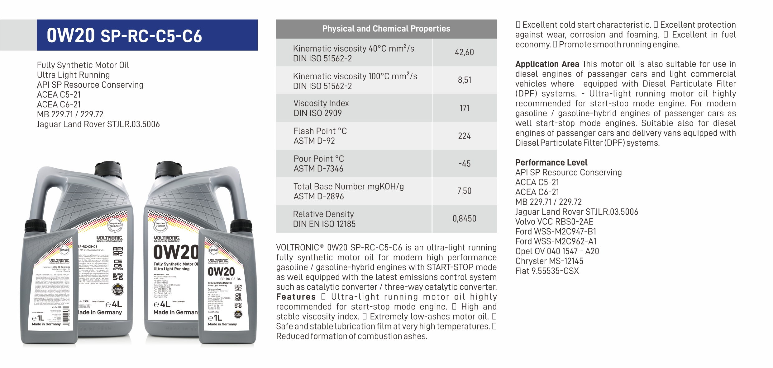 VOLTRONIC® 0W20 SP-RC-C5-C6 is an ultra-light running fully synthetic motor oil for modern high performance gasoline / gasoline-hybrid engines with START-STOP mode as well equipped with the latest emissions control system such as catalytic converter / three-way catalytic converter.