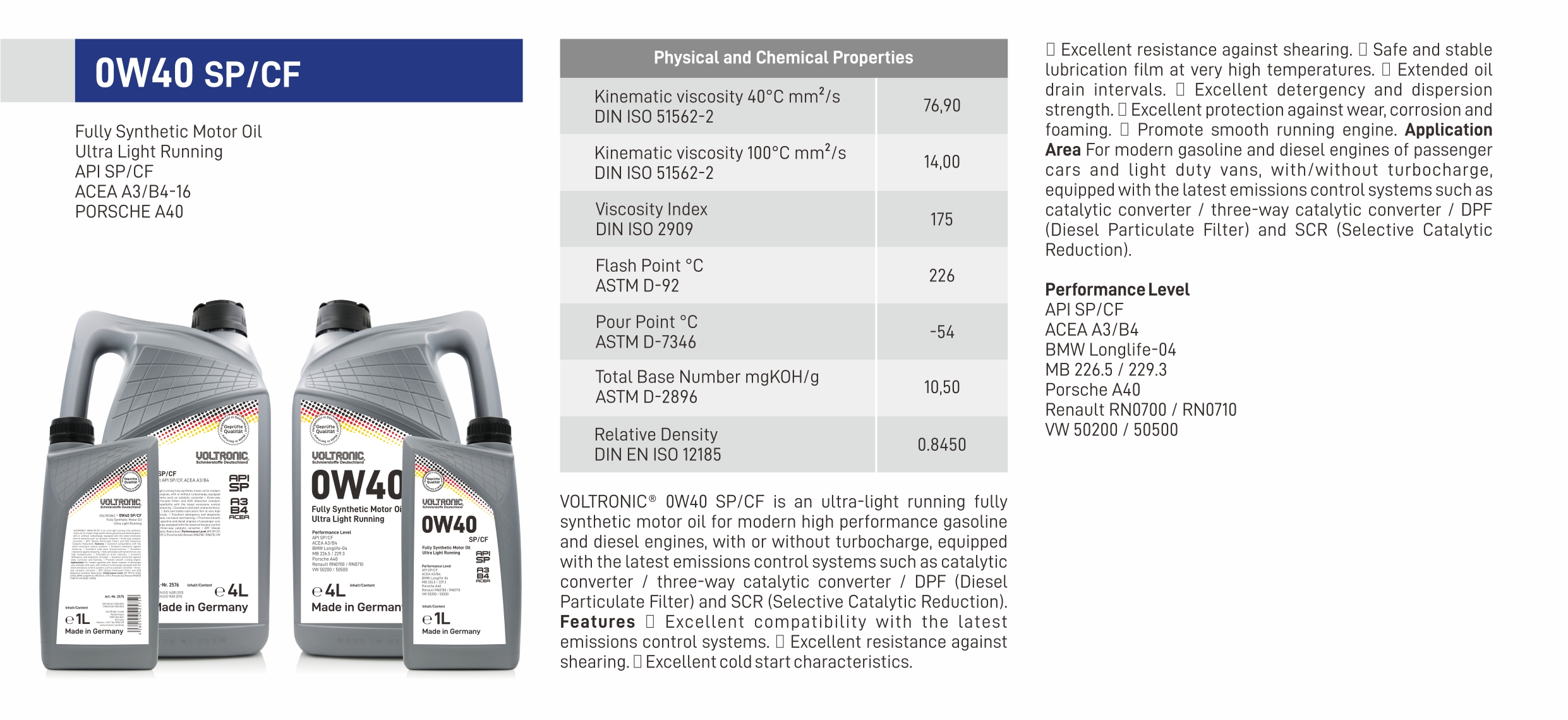 VOLTRONIC® 0W40 SP/CF is an ultra-light running fully synthetic motor oil for modern high performance gasoline and diesel engines, with or without turbocharge, equipped with the latest emissions control systems such as catalytic converter / three-way catalytic converter / DPF (Diesel Particulate Filter) and SCR (Selective Catalytic Reduction).
