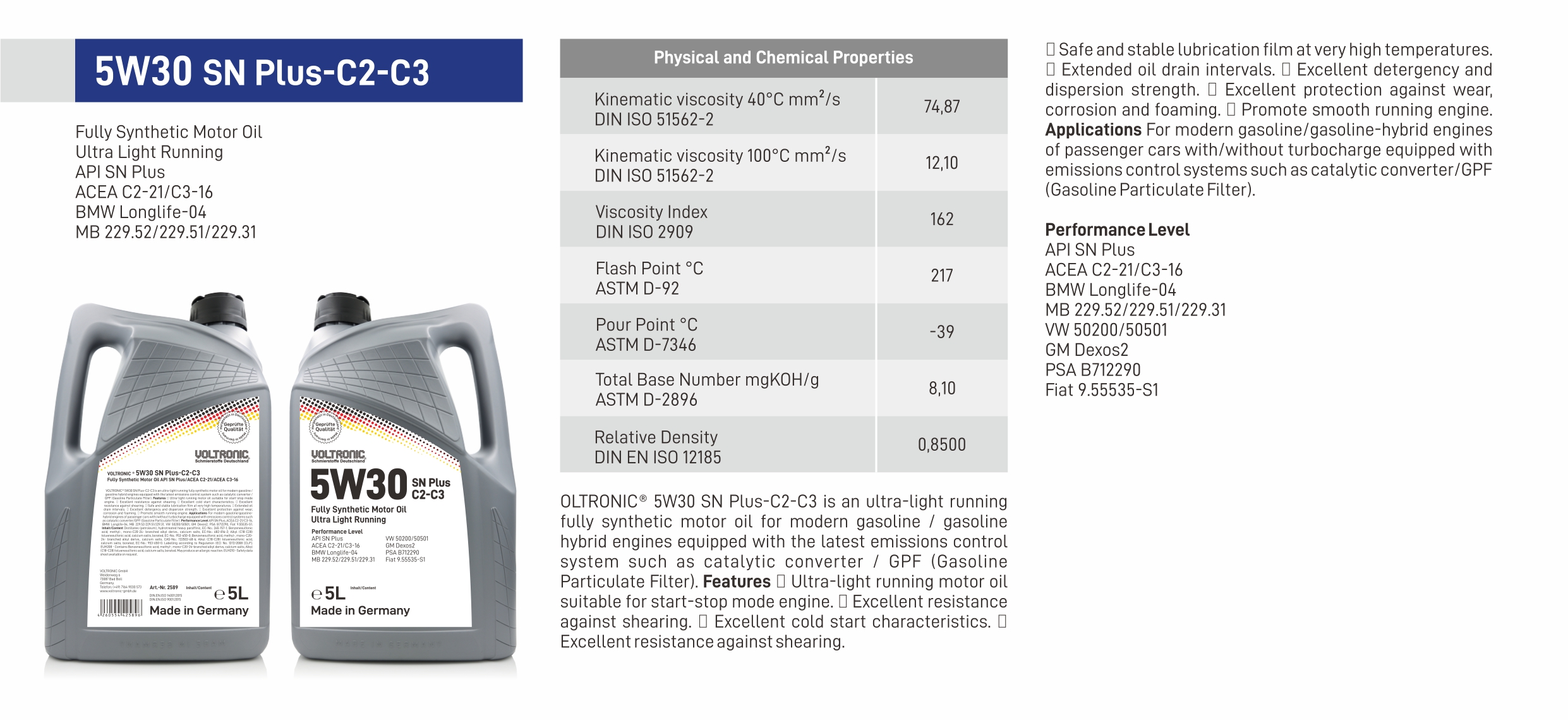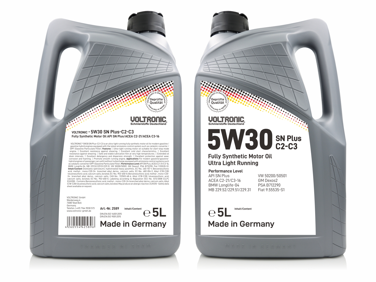 VOLTRONIC® 5W30 SN Plus-C2-C3 is an ultra-light running fully synthetic motor oil for modern gasoline / gasoline hybrid engines equipped with the latest emissions control system such as catalytic converter / GPF (Gasoline Particulate Filter).