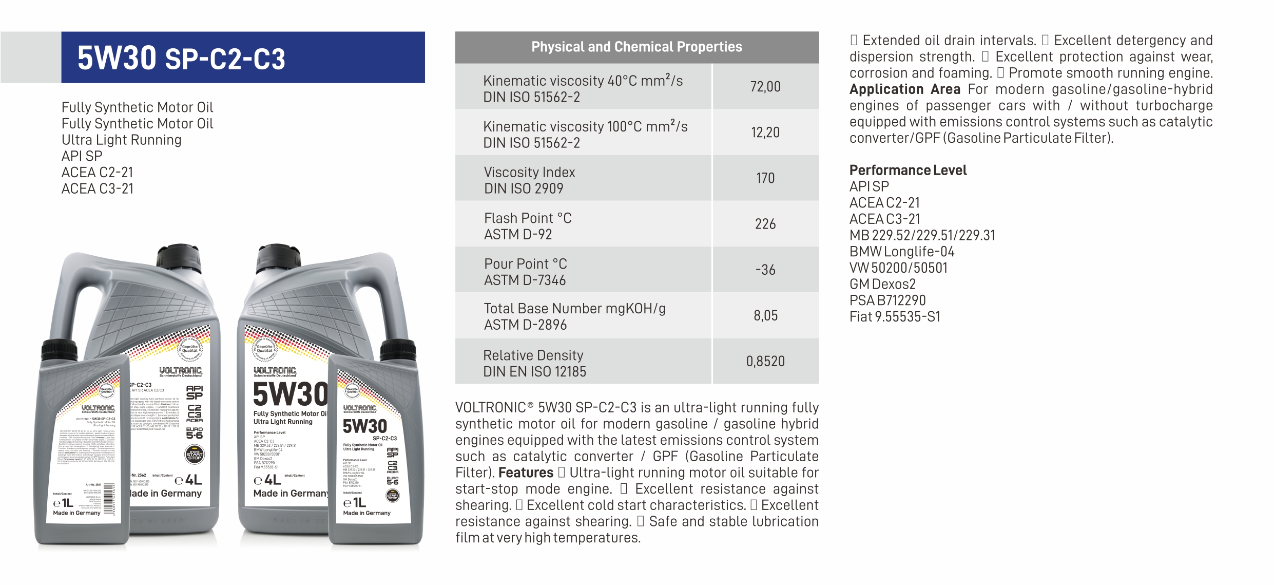 VOLTRONIC® 5W30 SP-C2-C3 is an ultra-light running fully synthetic motor oil for modern gasoline / gasoline hybrid engines equipped with the latest emissions control system such as catalytic converter / GPF (Gasoline Particulate Filter).