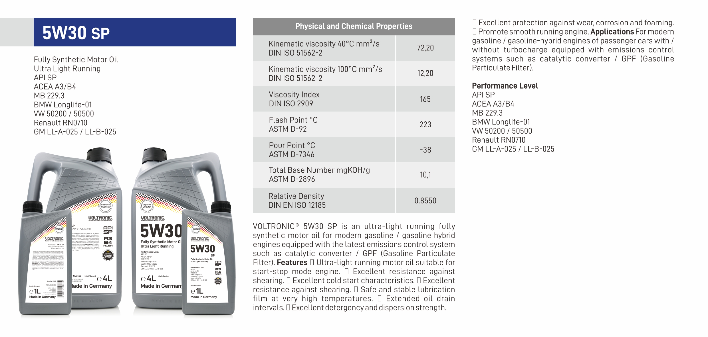 VOLTRONIC® 5W30 SP is an ultra-light running fully synthetic motor oil for modern gasoline / gasoline hybrid engines equipped with the latest emissions control system such as catalytic converter / GPF (Gasoline Particulate Filter).